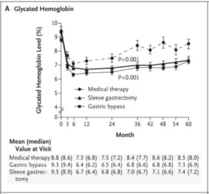 ✔️Rápida Mejora del Azúcar en Sangre: Después de tan solo 3 meses de la cirugía (ya sea bypass gástrico o gastrectomía en manga), los niveles de hemoglobina glicosilada (HbA1c) y de glucosa en ayunas mejoraron de forma rápida y notable. Esta mejora se mantuvo a lo largo de un año de observación. En contraste, el grupo que solo recibió terapia médica tuvo una mejora más pequeña y gradual.