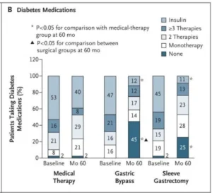 ✔️Menos Medicamentos para la Diabetes: Una de las noticias más emocionantes para los pacientes es la reducción en la necesidad de medicamentos. En el grupo de terapia médica, el número promedio de medicamentos para la diabetes tendió a aumentar. Sin embargo, en los grupos quirúrgicos, este número disminuyó significativamente. ¡Imaginá poder reducir o incluso dejar de tomar algunos de tus medicamentos diarios! Por ejemplo, el uso de insulina disminuyó drásticamente en los grupos de cirugía.